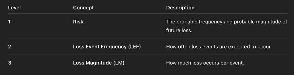 FAIR decomposes these into finer layers such as Threat Event Frequency, Vulnerability, and Primary/Secondary Loss Magnitude to arrive at a realistic distribution of outcomes.